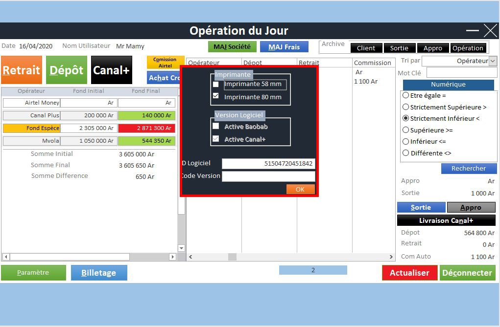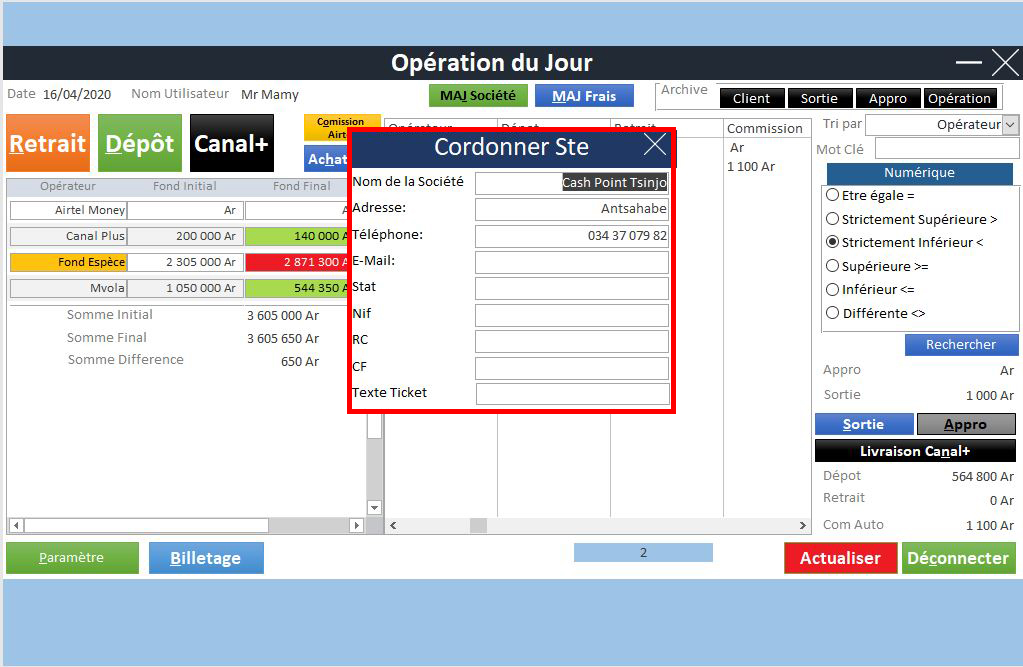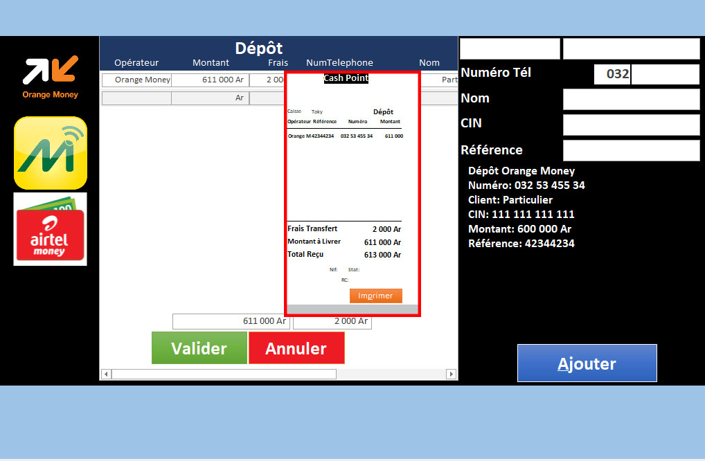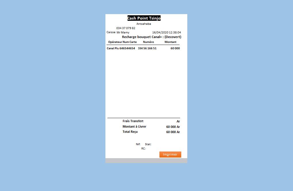 Le Logiciel de Caisse Cash Point est conçu pour les points de vente et les services financiers qui offrent des dépôts, des retraits, des transferts d'argent et la gestion de stocks physiques et virtuels. Ce logiciel facilite la gestion des transactions en espèces, des services mobiles (comme MVola, Orange Money, Airtel Money), ainsi que des opérations de caisse avec une comptabilité précise, des commissions automatiques et un suivi détaillé des mouvements de stocks.