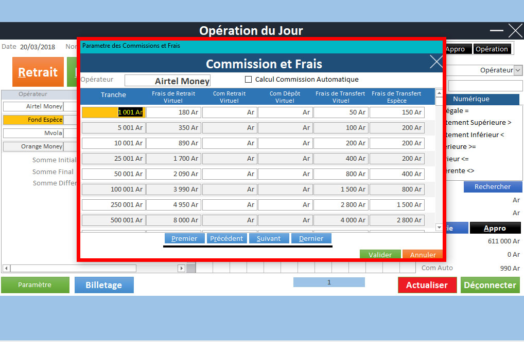 | Paramètrage des Frais de transfert et Commission | ✔ | |